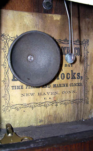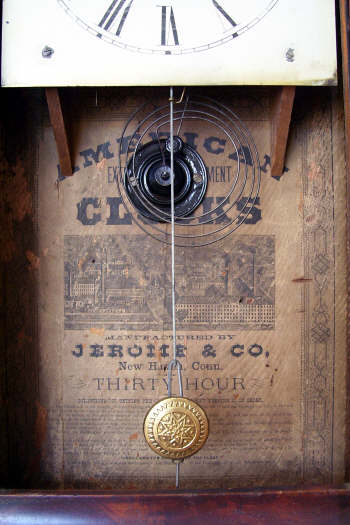 I think this is rather an impressive antique mantel clock: behind the rear-painted glass there is a pendulum which is attempting to simulate a sophisticated mercury-bearing pendulum. The bell is behind the pendulum. There is a partly damaged label on the rear of the case with the words "1 Day VICTO..", "STRIKING", "JEROME &.." and "NEW HAVEN, CONN,..". There follows brief instructions re. regulating and setting the clock, cautioning about moving the hands past a chiming point (re. the "warning"? Sorry, I'm no horologist but I do understand that something significant happens just prior to a clock striking!).